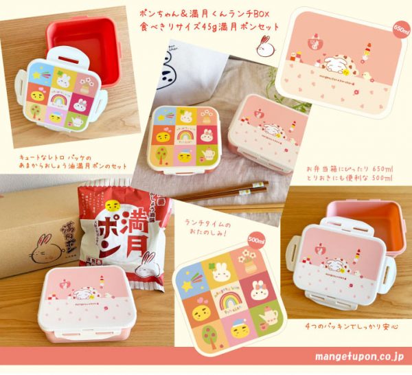 とってもキュートなランチBOXが 出来ました! ● 12センチ角の 正方形 と 12センチ×15センチの 長方形 絵柄違い どちらかお選びいただけます! 45g満月ポン1袋のギフトセットです。 ほのぼの【ポンちゃん絵本カー…